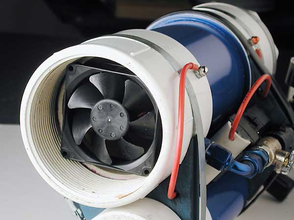 The fan is usually placed near the rear of the chamber for easy maintenance and blowing toward the muzzle to push the fuel into the existing air. During ventilation the fan draws fresh air into the chamber and exhausts through the muzzle end. The endcap must be removed first to let fresh air in and removing the barrel or opening the bolt will further improve circulation. Brushless motors are non reversible which makes it difficult to change the direction of air flow. Pictured here is a 50mm CPU fan on a tower mount.