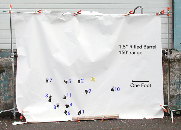 Just for grins, a 1.5'x56' vented barrel was tested at 150'. Almost half of the vented shots hit the ground before reaching the target due to the loss of 14" of effective barrel. Future tests will explore the stabilization properties and muzzle velocities of vented barrels. Also fired from 150' was a 2"x 32" smooth bore with a C:B ratio of 1.5:1. The 2" barrel performed excellent, maybe as good as the smooth bore 1.5" barrel. Unfortunately, the 2" shots were not recorded , then it started to rain again. Four cheesy animated gifs of the outdoor tests are available below.