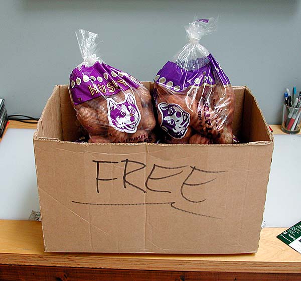 The outdoor test was delayed for nearly a week by rain. The day the skies finally cleared, 25 lbs. of russets deemed unsafe by the Emergency Feeding Program were left on our doorstep.