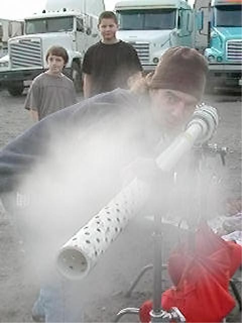 Without delay, the equipment was gathered for the long range tests. The launcher and barrels were the same used in the 50' tests. Again, 37 PSI fuel pressure was used for a calculated 4% propane mixture.
