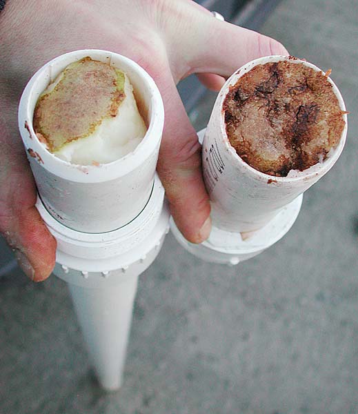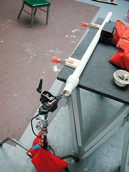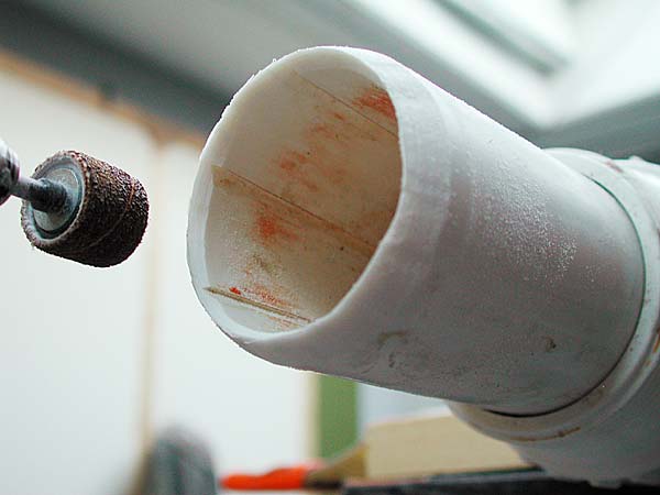 "Increase Accuracy and Safety with Rifled Barrels.." is what we read at spudtech.com and the claim we set out to test. That's right, rifled PVC barrels for potato guns. These barrels are hand made at the Spudgun Technology Center using custom machinery and mysterious techniques. The price is a steal, only a little more than the raw materials themselves. We purchased our 1.5" rifled barrel over the telephone directly from Joel Suprise, the owner of STC. It arrived at Burnt Latke headquarters on time packaged in a triangular box. Inside the barrel was a note about safety and a reminder that the barrel is unidirectional. The barrel is usually marked on the muzzle end but ours came pre fitted with a 2" male thread which made it easy to figure out which side faces forward.