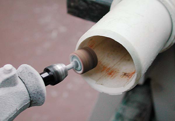 A ghetto lathe was made with some blocks of wood clamped to the table. The barrel was rolled toward the wooden blocks by hand. The stand with clamp could be replaced by a someone holding the Dremel against something sturdy.