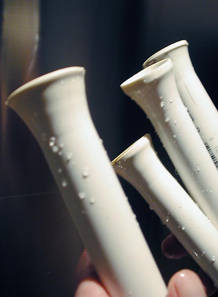 The finished rocket, fragile but powerful. When shot from a combustion launcher, these rockets can penetrate completely through 3/4" plywood. The rocket usually does not survive as the tail breaks when passing through the smaller hole. Visit the launch examples page for pictures of PVC rockets in action.