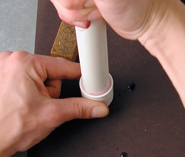 Prime and cement the end cap to the tip of the rocket. This is a good chance to use up some of that purple primer that's been kickin' around. Check the expiration date on the bottom of the can.