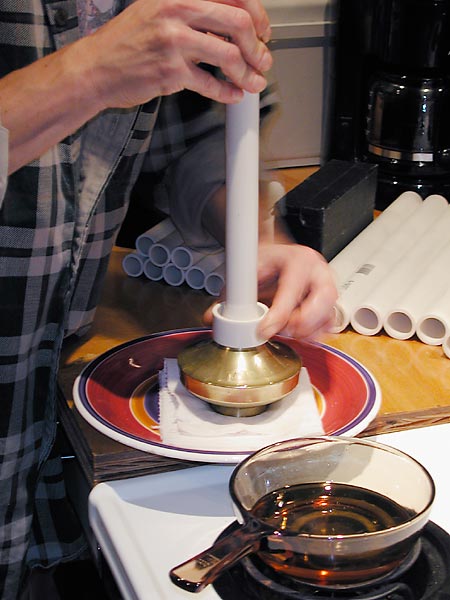Prepare the pipe by cutting, deburring and washing to remove anything that would cause the oil to splatter. If the pipe is washed with water, dry it completely inside and out to avoid severe oil splatter. Heating the oil is the toughest part, Bring the oil up to temperature slowly. It takes longer to cool the oil down than to heat it up so take your time. In a small pan (not your wife's or Mom's), heat about .6" of cooking oil until it will soften PVC. If the oil smokes, it is way too hot. Place one end of the pipe in the oil and hold. After about 20 seconds the PVC will begin to soften allowing you to start the bell shape flare on the bottom of the pan. Spin the pipe to achieve an even shape.