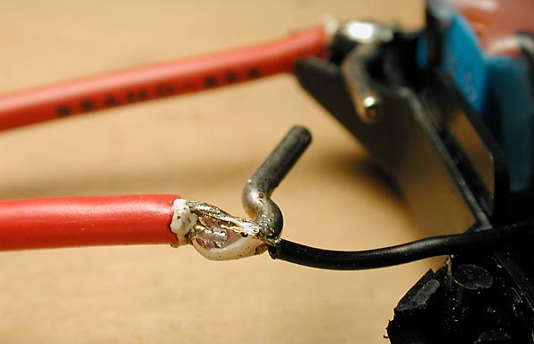 Solder your leads to each of the forward facing electrodes. This is a tricky solder job. For a proper union, all three surfaces must reach solder melting temperature. The electrode is thick and takes time to heat up. The black wire heats up fast and may require a heat sink (hemostat). Keep the joint streamlined so the electrode will fit back into position.