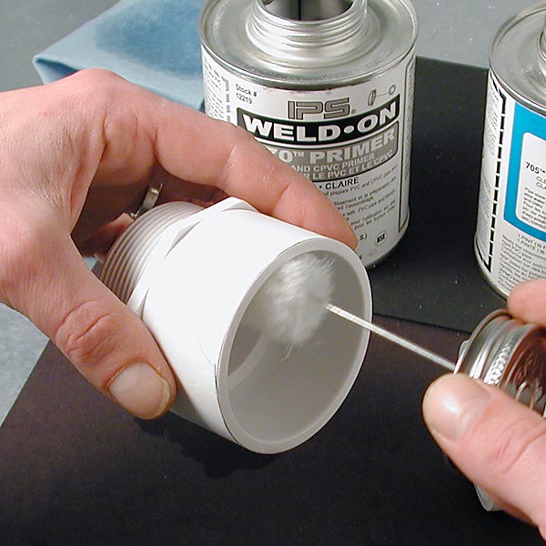 Quickly apply the cement from the opened can. Now is not the time to find out the lid is stuck on. Use a medium bodied, clear PVC cement which is actually just primer (solvent) with PVC polymers added to help the union and fill cracks. Apply to both male and female parts avoiding contact with threaded areas. Mask the threads with tape if needed beforehand.
