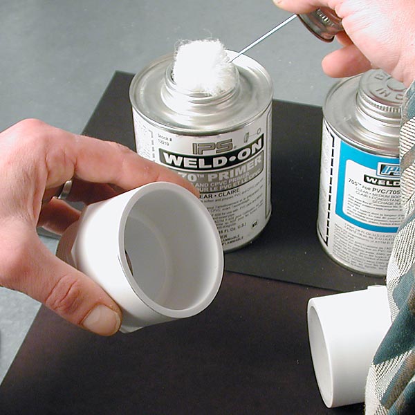 PVC primer and cement come in a variety of sizes and flavors. A dauber is included inside each can. The small dauber in the 8oz. can is good for small fittings and pipe. For larger diameters, use the pint can with the larger dauber. You can buy fancy brushes and daubers from a plumbing supply shop. Purple primer works fine except, it's purple. Clear primer is available to keep your launcher lookin' good although it can be hard to find. Before you start, check that both cans open easily, use channel locks if necessary.